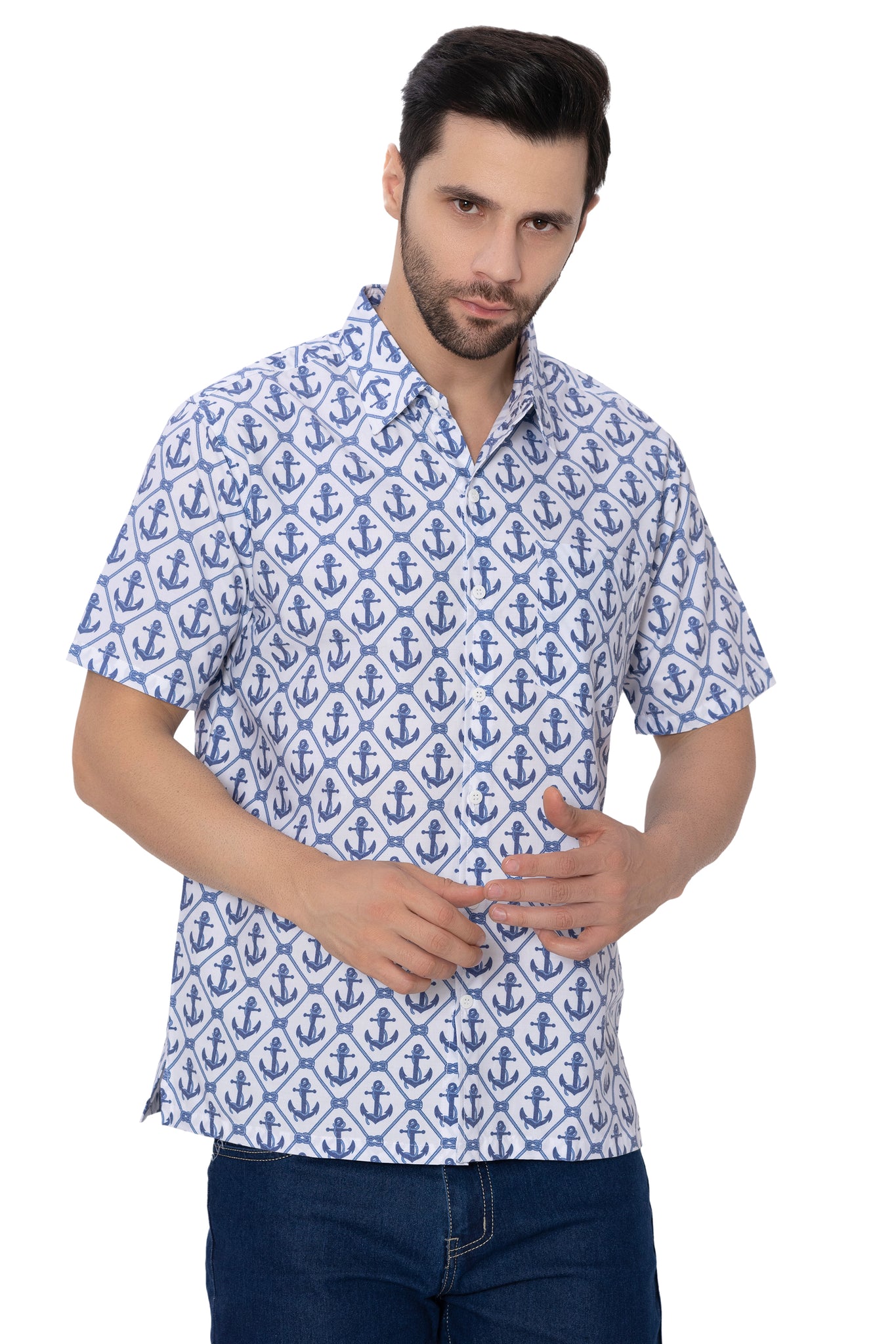Unleash your nautical spirit with our Men's Rayon Shirt Collection, featuring the timeless White Anchor-Printed shirt.