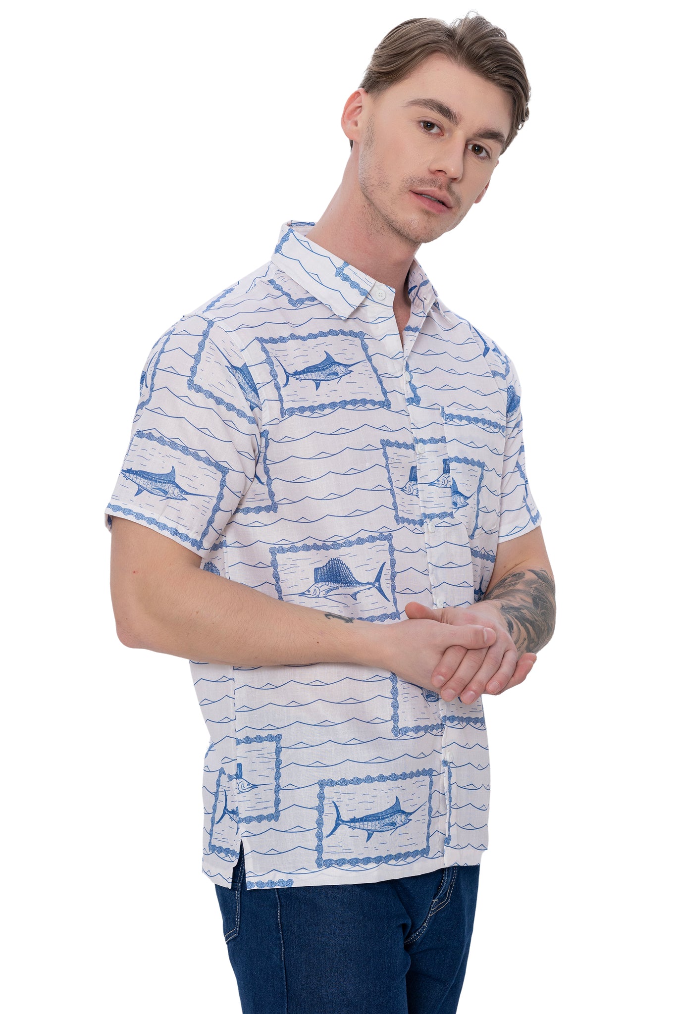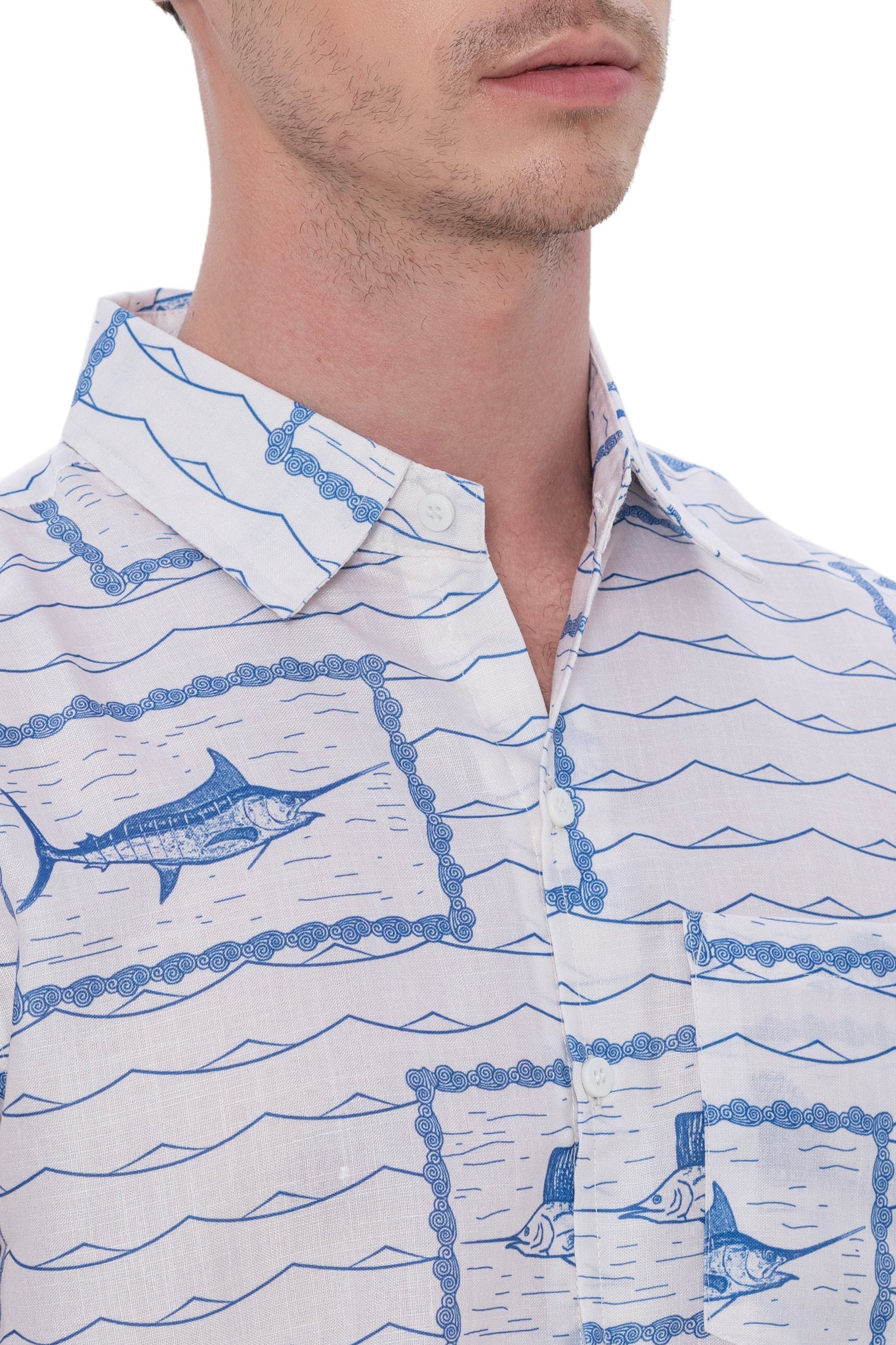 Behold the Linen Effect Men's Shirt featuring a captivating Palm Tree and Island print in classic White and Royal Blue.