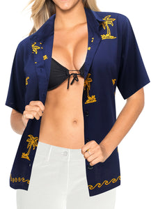 LA LEELA Women's Beach Casual Hawaiian Blouse Short Sleeve button Down Shirt Aloha Navy Blue