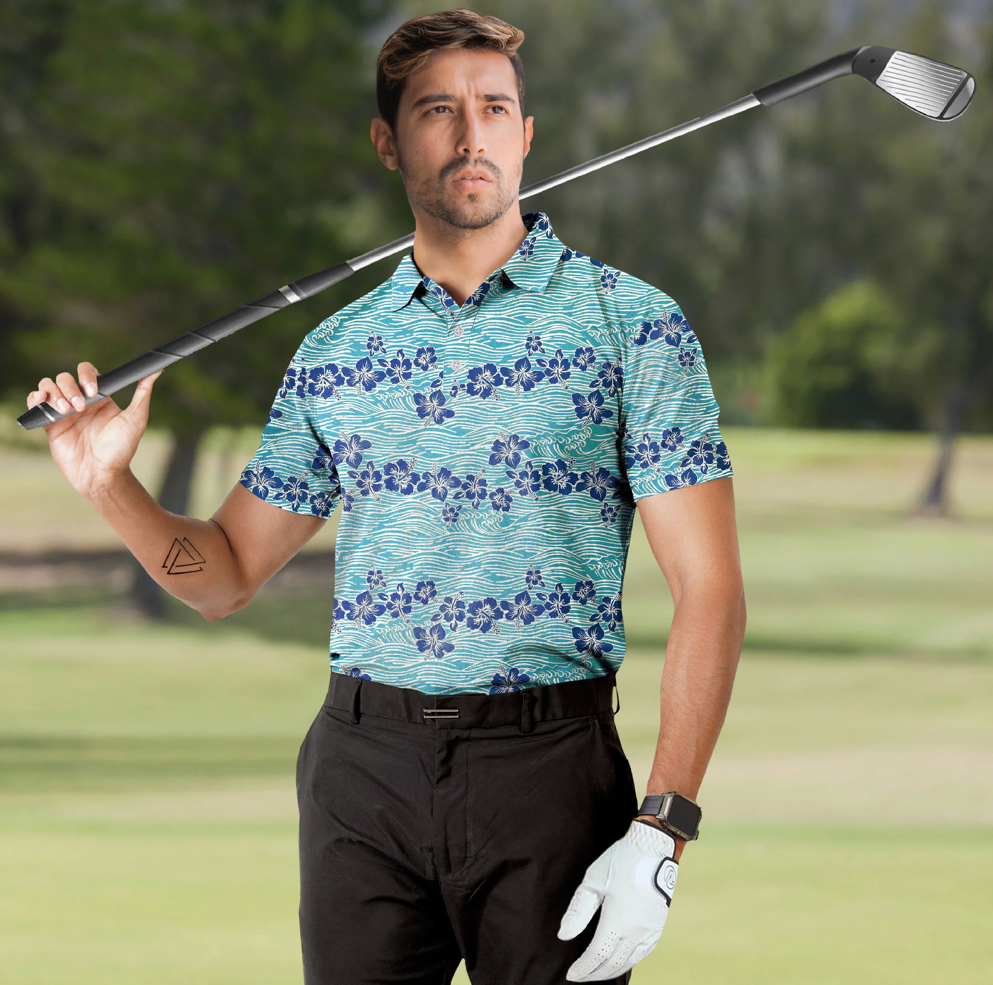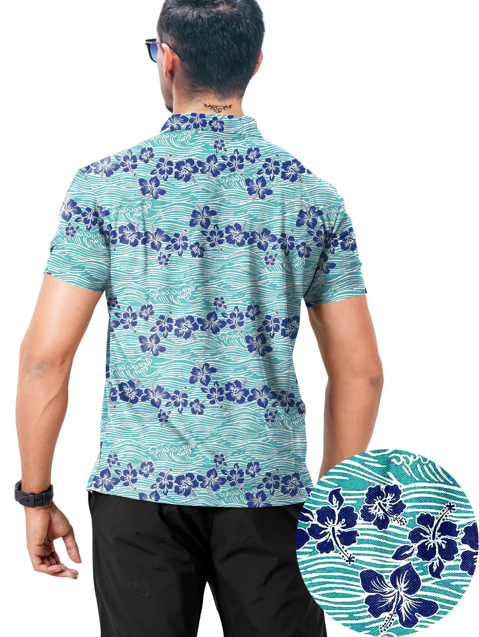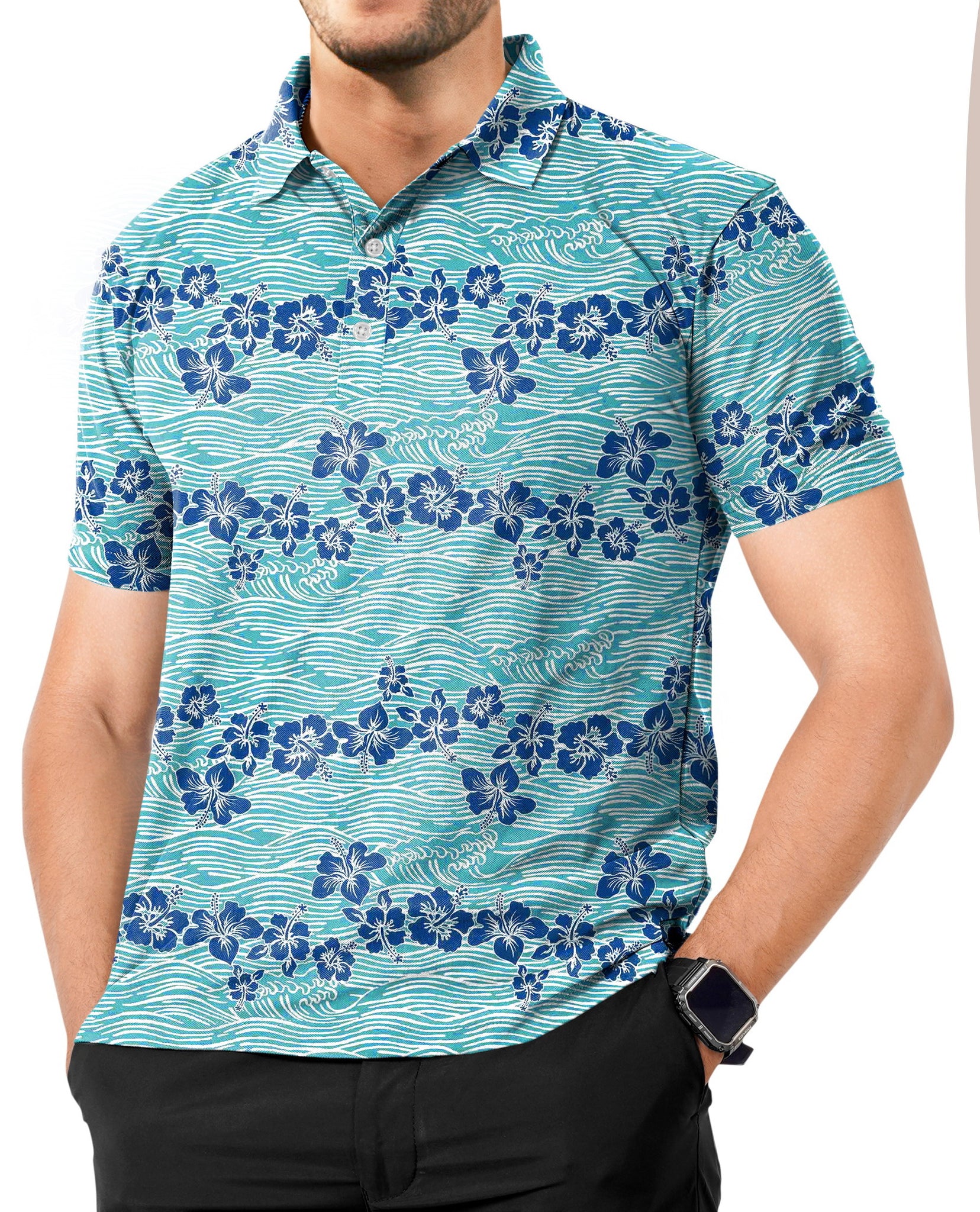 Step into the world of sophistication and comfort with our Men's Golf Polo Tee Shirt featuring an exquisite design of allover Hibiscus Floral and Waves against a regal Teal Blue backdrop. Crafted with precision and style in mind, this polo shirt is the epitome of modern fashion and versatility.