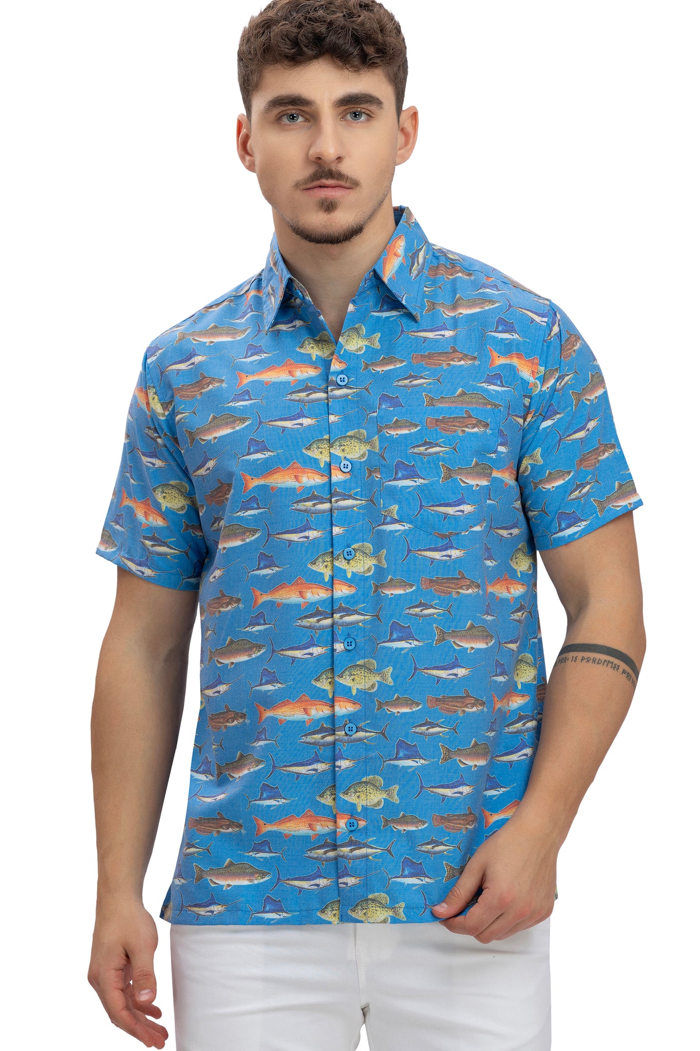 Occasion: This Fish-Printed Rayon Men's Shirt is the perfect choice for those who want to infuse a bit of personality into their style. Ideal for casual outings, beach side gatherings, or a weekend brunch, this shirt effortlessly transitions from day to night. Pair it with chinos for a laid-back yet polished look, or team it up with shorts for a relaxed vibe. Let your style swim against the current with this distinctive and fashionable shirt.