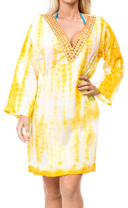 LA LEELA Cotton Tie_Dye Short Caftan Vacation Dress Yellow_A388