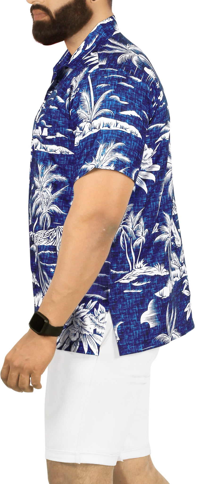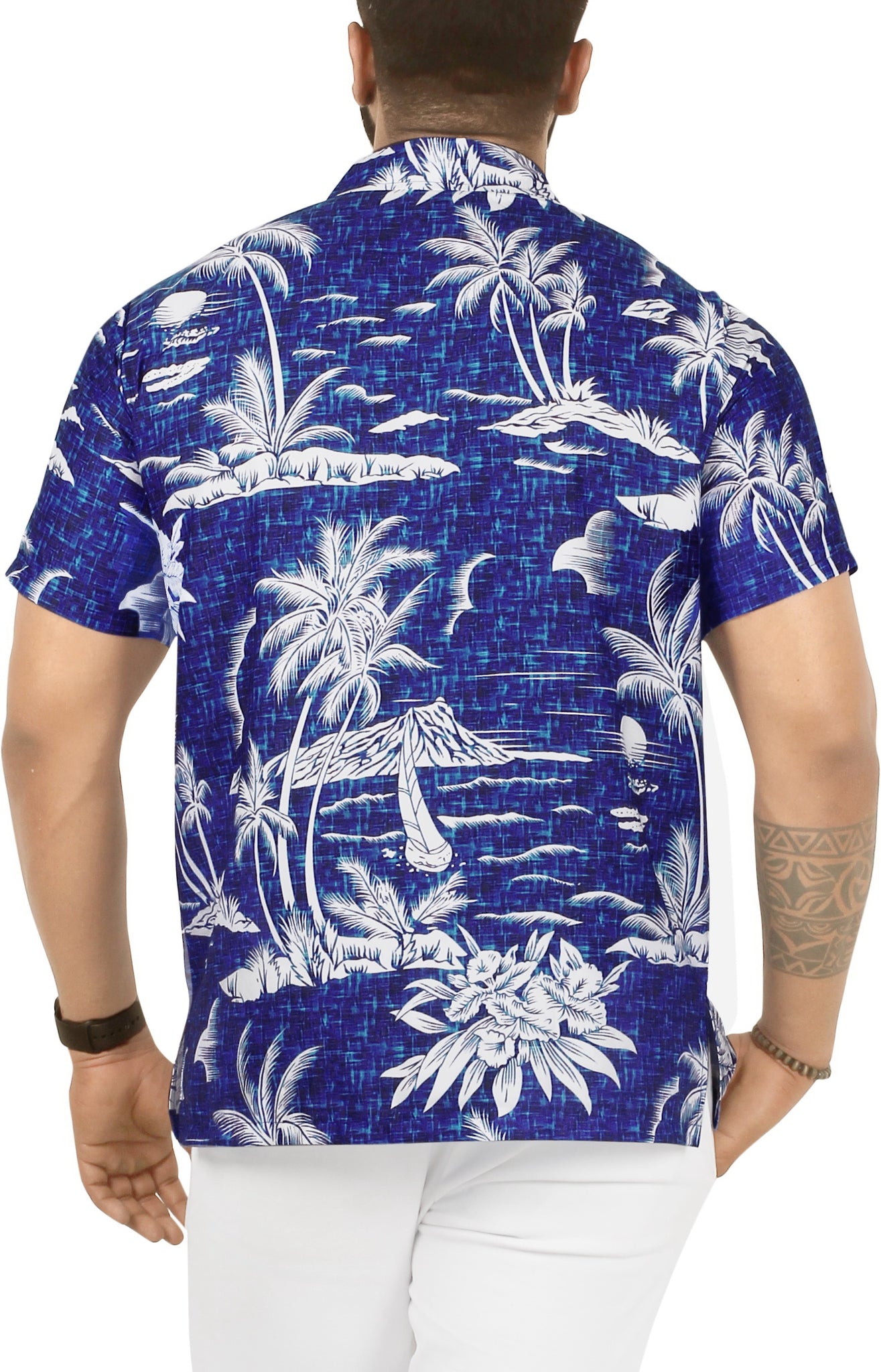 Royal Blue Tropical flower and Island View Printed Hawaiian Beach Shirts For Men